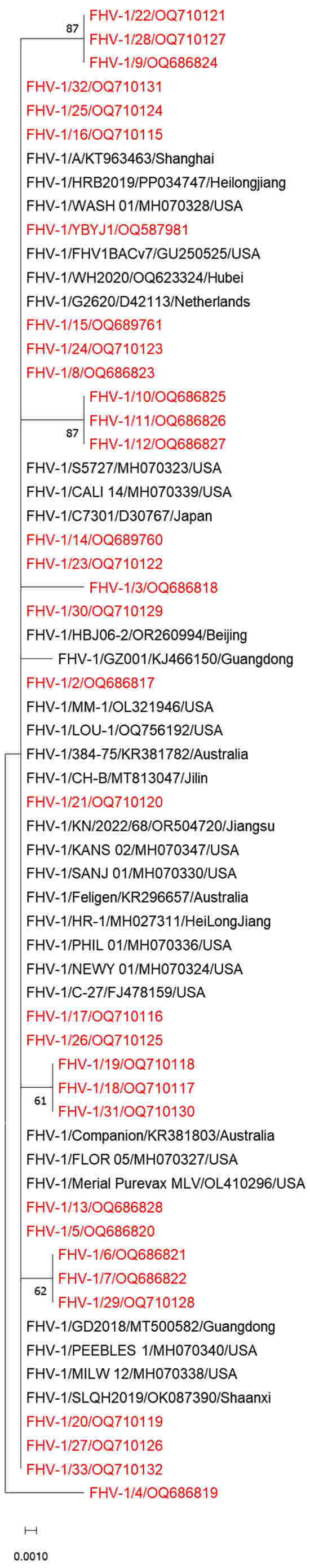 A phylogenetic tree based on the gD sequences of FHV-1 was constructed via the neighbor-joining method. The labels used to distinguish the different strains are as follows: the red label represents the FHV-1 samples involved in this study.