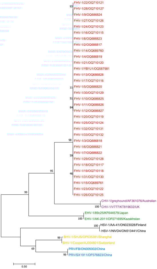 We also selected other host herpesviruses, including equine herpesviruses (EHV-1) OP271695 and KF644579; bovine herpesviruses (BHV-1) OP035381 and AJ004801; herpes simplex viruses (HSV-1) ON023028 and ON513441; pseudorabies viruses (PRV) ON005002 and OP376823; and canine herpesviruses (CHV-1) AF361076 and KT819633, for a total of 10 reference strains. The phylogenetic analysis of all sequences using Mega 11 showed that 33 FHV-1 sequences and 10 other host herpes viruses have a distant relationship (Figure 3).