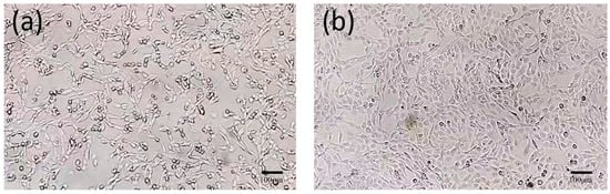 Microscopic observation of cell results (×100). (a): Virus-inoculated F81 cells; (b): Normal F81 cells.