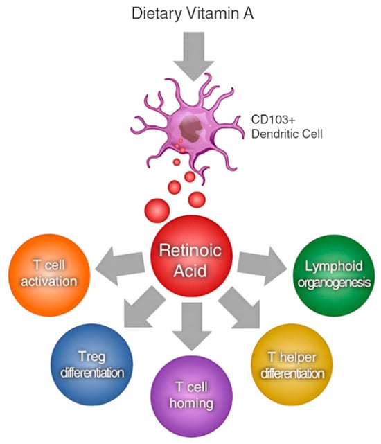 Beyond vision, vitamin A is crucial for cellular differentiation and proliferation. ATRA, the active metabolite of retinol, regulates gene expression by binding to nuclear receptors, controlling the transcription of genes involved in cell growth, differentiation, and apoptosis [29,30,31,32]. This regulation is vital for maintaining epithelial tissues such as the skin, respiratory tract, and gastrointestinal lining [33,34]. Additionally, vitamin A enhances immune function, supporting T cells, B cells, and natural killer cells, while maintaining mucosal barriers [35] (Figure 2).