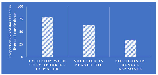 A study conducted on chickens demonstrated the effect of these auxiliaries on the bioavailability of vitamin A solutions administered through injection. Figure 4 illustrates the variation in vitamin A retention observed when different additives were used in the solutions.