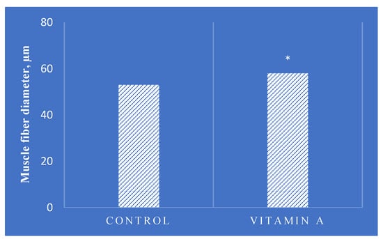 Average latissimus dorsi muscle fiber diameter at harvest (adapted from Wang et al., [23]). Angus steer calves were administered with 0 (control) or 150,000 IU vitamin A (retinyl palmitate) per calf at birth and 1 month of age. The resulting steers were harvested at 14 months of age. * p < 0.05; Mean, n = 9.
