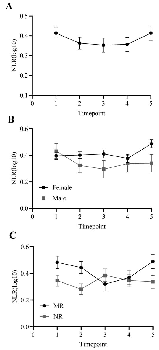 | Cross-sectional data: NLR highest in middle-aged individuals. Higher NLR in males and mother-reared individuals. | ||||