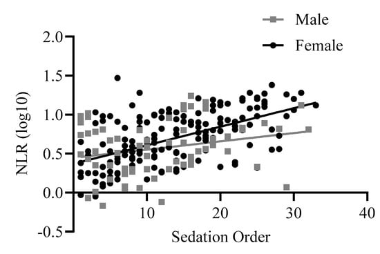 Chicago/Turabian StyleNeal, Sarah J., Steven J. Schapiro, and Elizabeth R. Magden. 2024. "Longitudinal Baboon (Papio anubis) Neutrophil to Lymphocyte Ratio (NLR), and Correlations with Monthly Sedation Rate and Within-Group Sedation Order" Veterinary Sciences 11, no. 9: 423. https://doi.org/10.3390/vetsci11090423