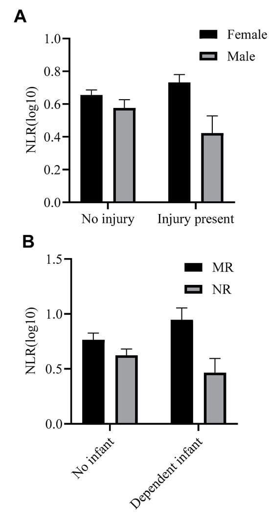 | 4. NLR and injury | Univariate ANCOVA | Entire sample, N = 231 | Sex, rearing | lg10NLR | Age | The main effects of sex and rearing were significant |