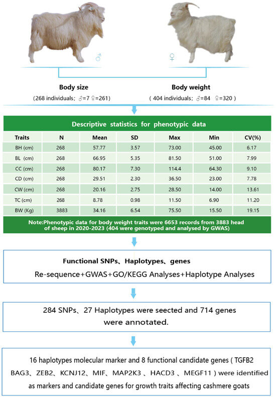 The goat, a highly adaptable ruminant, ranks among the earliest animals domesticated by humans. Variations in the natural environments and economic conditions across its distribution areas have led to its differentiation into fur, milk, and meat goats [1]. According to the survey statistics from the Sheep Annals of Chinese Livestock and Poultry Genetic Resources, China currently hosts 69 goat breeds; these include fifty-eight local breeds, eight breed varieties, and three introduced breeds, which are categorized based on their production purposes into meat, wool, hair, and milk types. The cashmere goat is a local, fine breed that has developed over an extended period through both natural selection and artificial breeding. Recognized as the world’s foremost breed for cashmere production, it is primarily found in China, Mongolia, Iran, and various other Asian countries. In China, the notable varieties of cashmere goat include Hexi, Liaoning, and Inner Mongolian cashmere goats. Among these, Inner Mongolian cashmere goats (IMCGs) can be further classified into three distinct types—Erlanglshan, Arbas, and Alashan—based on their geographical origin, each exhibiting strong meat production capabilities and a uniform distribution of fat. Growth traits serve as critical economic indicators in livestock meat production, as they provide insights into the carcass quality, the meat yield, feed efficiency, and disease resistance [2,3].