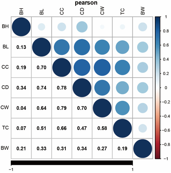 The results of the descriptive statistical analysis for the phenotypic data related to growth traits are presented in Figure 1. The coefficient of variation for body weight was relatively high at 19.15%, indicating a wide distribution and potential for improvement through selective breeding. In contrast, the coefficients of variation for body height, body length, chest circumference, chest depth, chest width, and tube circumference were all below 15%. Specifically, the coefficient of variation for chest width was 13.61%, while body height exhibited the lowest coefficient at 6.17%. This suggests a non-uniform population distribution, which is crucial for maintaining genetic diversity. Correlation analysis revealed a positive correlation among all traits, with a particularly strong positive correlation between chest circumference and chest width (see Figure 2). As illustrated in Figure S1, the phenotypic data for all traits followed a normal distribution, making it suitable for further analysis.