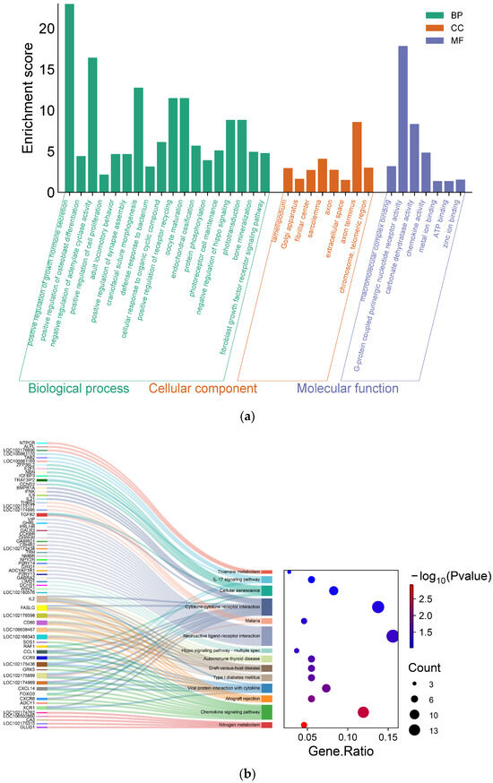 Enrichment analysis of growth traits of IMCGs (Erlangshan type). (a) Secondary classification histogram of Gene ontology (GO) enrichment analysis of candidate genes. (b) KEGG enrichment analysis diagram.