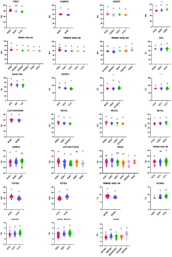Association analysis of haplotype combinations with growth traits in IMCGs (Erlangshan type) (a–c); significant differences between genotypes indicated with different lowercase letters (p < 0.05). x-axis indicates haplotype combinations, y-axis indicates phenotypes corresponding to growth traits, and markers at the top of the graph are annotated candidate genes, which include PBX1, GABGR1, AADAT, TRNAS-GGA-82, KIAA1109, IGFBP3, REV3L, ARMC2, BAG3, TRNAG-UCC-59, TGFB2, TRNAG-UCC-34, KCNK9, FASTKD2, HACD3, MEGF11, and SLC8A1. Body Height (BH), Body Length (BL), Chest Circumference (CC), Chest Depth (CD), Chest Width (CW), Tube Circumference (TC), Body Weight (BW).
