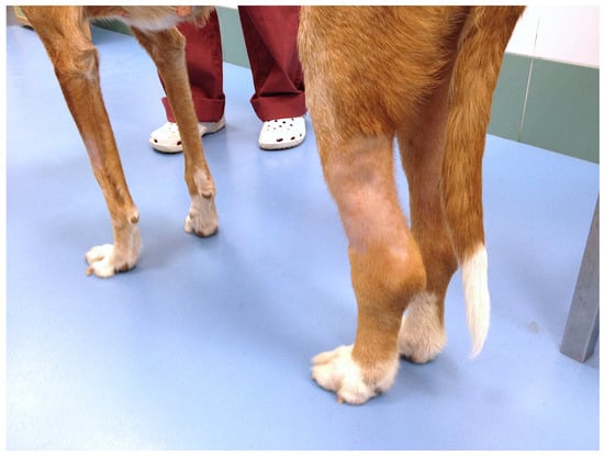 As in the study by Souza et al. [], our dogs experienced an improvement in clinical signs (pain, erythema, and firmness of the lesions) in at least one characteristic in most animals at day 15 (80%) and day 30 (66%) after starting the treatment. In other canine cancers, TKIs have improved tumor-related clinical signs, despite the progression of the disease according to RECIST criteria []. Therefore, TKIs could have an effect that targets the angiogenic component of the tumor through unknown mechanisms. In canine IMC, this could be due to antiangiogenic activity and/or blockade of VEGFR pathways implicated in lymphangiogenesis, an over-activated pathway in this disease, leading to an improvement in lymph flow and edema [,]. This clinical improvement was observed in all the dogs with lymphedema of the extremities in our study.