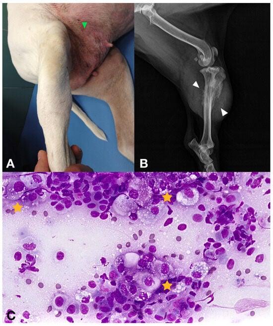 (A) 16-year-old female with a secondary IMC showing a diaphyseal tibial firm mass on the right rear leg. Erythema and inflammation with cutaneous nodules were also obvious in the inguinal mammary glands (green arrowhead). (B) Diaphyseal tibial aggressive bone lesion with osteolysis and osteoproliferation (white arrowheads). (C) Cytology obtained via 18 G needle aspirate under sedation. Epithelial cell clusters revealing atypical cells consistent with metastatic neoplasia (yellow stars).