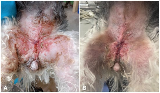 (A) Erythema and cutaneous nodules in a female dog with primary IMC. (B) The same dog as in image A, showing slight improvement of erythema and degree of inflammation after one month of treatment.
