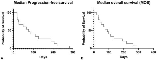 (A) Kaplan–Meier curve for progression-free survival. The median PFS was seventy-six days. (B) Kaplan–Meier curve for overall survival. Median overall survival was ninety days.