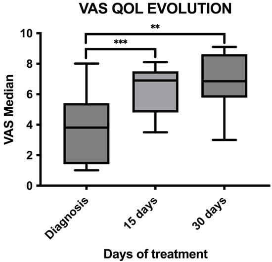 Graph comparing median QOL VAS between diagnosis (VAS median 3.66) and day 15 (VAS median 6.38), showing significant improvement (p = 0.0009), as well as between diagnosis and day 30 (VAS median 6.75), showing significant improvement (p = 0.001). No significant differences were found between day 15 and day 30 (p = 0.22). **, p < 0.01; ***, p < 0.001.