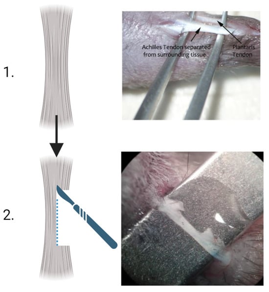 Figure 1. Illustrative images of the tendon injury in the mouse AT model. (1.) The tendon was identified, exposed, and isolated from adjacent tissues. (2.) A controlled lesion, not exceeding 50% of the total tendon diameter, was created at the mid-length of the tendon using a scalpel blade. The images were obtained using a stereomicroscope during the surgical procedure.