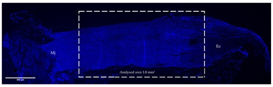 Figure 2. Example of a detailed large-format image representing an injured tendon tissue in high resolution. The quantification analysis was conducted in a defined area of 1.8 mm2 (length × width: 3 mm × 0.6 mm), and the myotendinous junction (Mj) and the enthesis (Ee) were not considered. Large images (LIs) were acquired using the Timelapse Nikon fluorescent microscope at 4× magnification, and then 12 detailed images within the considered area were taken of each tendon in the analysed area at 40× magnification. Scale bar = 500 µm.