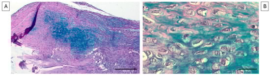 Figure 4. Representative images of Alcian Blue staining obtained from tendons at 28 days p.i. The staining in image (A) (scale bar = 500 μm—10×) shows the positivity to Alcian Blue in the tendon, and (B) shows a detailed 20× image of the chondrocyte-like cells within spontaneously healed tendons (scale bar = 50 μm). The positivity is visible as a bright blue staining surrounding the chondrocyte-like cells in the ECM, where proteoglycans are released.