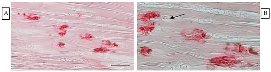 Figure 5. Representative images of Alizarin Red staining showing (A) calcium deposits within the tendon tissue at 28 days p.i. and surrounding the nuclei (arrow). Scale bar = 250 µm. (B) The presence of calcium deposits arranged around the chondrocyte-like cells. Scale bar = 100 µm.
