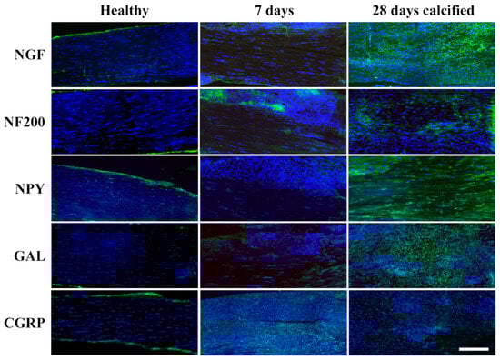 Figure 6. Exemplary LI images of samples showing the neuromarker distribution in healthy, 7-day and 28-day tendons. For the 28-day time point, only calcified samples are shown as an example. In the healthy tendon (left), positivity can be observed concentrated in the paratenon and endotenon, whereas, in the rest of the images, fluorescence expression can be observed in the tendon proper. Scale bar = 200 µm. Green channel (AlexaFluor 488) represents the each analysed neuromarker, whereas the nuclei are stained with DAPI (blue).