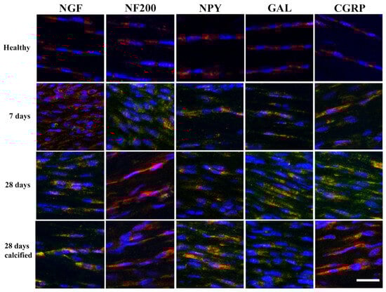 Unlike observations in rat and human tendons [19,21,51], a pivotal finding of this study was also the presence of neuromarkers not only accumulated in the ECM but also within tendon cellular populations such as tenocytes and chondrocyte-like cells. In particular, this study showed the presence of several chondrocyte-like cells in the healing tendons at 28 days p.i. These are cells exhibiting features similar to chondrocytes, such as high positivity for Alcian Blue, round nuclei and pericellular lacunae. However, they expressed TNMD, a typical tenogenic and not chondrogenic marker. No current in vitro/in vivo studies have discussed this evidence; however, the current literature demonstrates that chondrocyte-like cells may arise during tendon differentiation [13,14], through the interplay of regulatory intracellular signalling controlling the commitment of common progenitor cells [52]. These cells also exhibited positivity for the analysed neuromarkers, suggesting a possible contribution of neuromarkers in inducing the metaplastic shift toward chondrogenesis and calcification. Specifically, high NGF levels have been recognised to be inductive of chondrogenic and bone differentiation through the activation of the Indian Hedgehog–parathyroid hormone-related protein signalling axis, a pathway which is vital in the proper development of calcification [53,54]. Previous evidence has also shown the crucial role of NPY in promoting chondrocyte hypertrophy [23]. On the contrary, no current evidence demonstrates any involvement of NF200, CGRP or GAL in chondrogenesis. However, the positivity of chondrocyte-like cells for neuromarkers is believed to be associated with cartilaginous metaplasia and ectopic ossification within healing tendons [55].