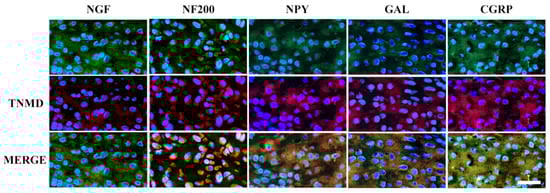 The samples were prepared and incubated with the primary and secondary antibodies following the above-mentioned protocol. After the secondary antibody incubation period, the samples were fixed with 4% formaldehyde for 10′ at RT, and then washed and blocked again using PBS/BSA 1%, followed by incubation of the primary antibody overnight and the secondary antibody for 1h at RT. The use of two secondary antibodies was necessary for the double IF staining performed with tenomodulin and each neuromarker. This required the use of a green channel (Alexa Fluor 488) for the neuromarker’s antibody and a red channel (Cy3) for TNMD, allowing for the simultaneous visualisation of both markers. Nuclei were stained with DAPI (Sigma-Aldrich, St. Louis, MO, USA, D9542, 1:100) for 10′ at RT. Negative controls were obtained by omitting the primary antibody but adding the secondary antibody. All negative controls proved to be negative.