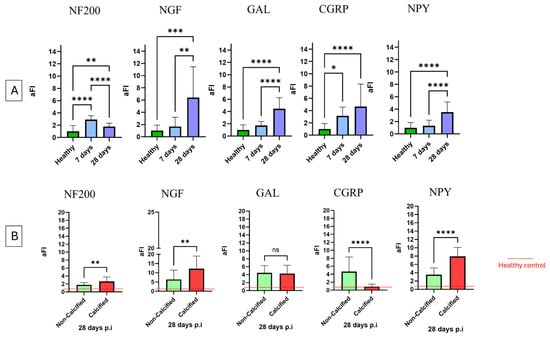 Figure 9. Graphical representation of the average fluorescence intensity (aFI) of each analysed sample. (A) aFI from healthy vs. 7 days vs. 28 days non-calcified p.i.; (B) 28 days p.i. non-calcified vs. calcified tissues normalised to the healthy tendon sample. In the statistical analysis, significance was expressed in * (p < 0.05), ** (p < 0.01), *** (p < 0.001), **** (p < 0.0001). Each sample was compared with the others.