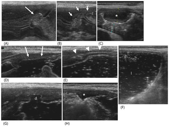 Ultrasonography of a 12-year-old spayed female maltese (Case 1) with uremic gastropathy before (A–C) and after GI hydrosonography (D–H). Upon conventional ultrasonography, (A) a crater-like mucosal defect (long arrow) was filled with hyperechoic gas in the gastric wall at the pylorus. (B) The collapsed pyloric antrum (short arrows) had a uniformly thickened wall with an irregular mucosal surface and poorly defined layers. (C) A focal hypoechoic wall thickening (asterisk) was shown. (D–H) After oral administration of saline, the gastric lumen was filled with fluid. (D) The mucosal defect (long arrows) was larger than that in (A) and located in the gastric body but not in the pylorus. (E) Note the echogenic line (arrowheads) within the gastric wall generated by intramural gas accumulation. (F) Normal wall thickness and layers were detected by the dilated gastric lumen (l). (G,H) The pylorus had irregular wall thickness due to another crater-like lesion (d), clearly thinner compared to the adjacent wall and focal thickened area (asterisk). Note a loss of clear definition in the wall layers in the focal thickened area.
