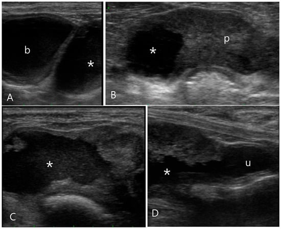 Ultrasonography of the prostatic cyst in a 11-year-old intact male Pekingese (Case 3). (A) Upon longitudinal ultrasound image, the asymmetrically enlarged prostate with a cystic formation (asterisk) was observed caudal to the bladder (b). (B) Transverse ultrasound images revealed the right prostate lobe almost entirely replaced by a cystic lesion filled with hyperechoic fluid, unlike the left prostatic lobe (p). (C,D) Sono-urethrography images obtained using agitated saline to enhance contrast, displaying the presence of microbubbles indicating the echogenic fluid leakage into the prostatic cyst. Additionally, these images demonstrate a clear communication between the prostatic cyst and urethra (u).