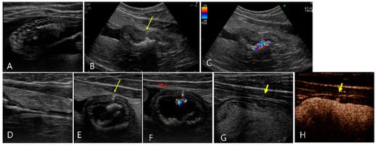 Ultrasound contrast agents (UCAs) consist of gas-filled microbubbles encapsulated in a shell that resonate when displayed on an ultrasound beam, enhancing imaging [,]. Contrast-enhanced ultrasonography (CEUS) generally evaluates the perfusion of lesions after intravenous injection of UCAs [,,,,,,,,,]. CEUS allows for real-time evaluation of wash-in and wash-out of the contrast agent and provides hemodynamic information representative of the blood volume and flow rate in the lesion. Because microbubbles can generate hyperechoic signals by reflecting and scattering sound waves, UCAs can also be used for intracavitary applications as an intraluminal CEUS to enhance the visualization of abscesses or fistulas in human patients [,,,]. For instance, the sulfur-hexafluoride SonoVue® (Braco, Milan, Italy) has been used to guide abscess drainage by being injected via drainage catheters, while hydrogen peroxide has helped identify anal fistulas and their internal openings by injection into the fistula tract [,,,,,].