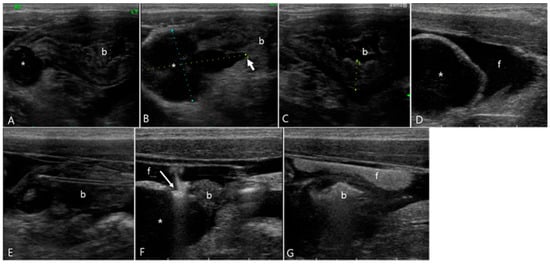 Ultrasonography of urinary bladder rupture in a 2-year-old male mixed cat (Case 6). (A,B) Cystic lesions (asterisk) filled with echogenic fluid were found within the bladder wall, located at the right side of the bladder apex. (C) The urinary bladder (b) was collapsed with an empty lumen and a bladder wall thickness of 8 mm. (D) Extensive anechoic peritoneal effusion (f) surrounded the cystic lesion (asterisk). (E–G) Upon sono-urethrography using SonoVue, a distinct echogenic linear leakage of the microbubbles (arrow) emanated from the cystic lesion, dispersed into the surrounding anechoic peritoneal effusion (f). (E) The urinary catheter was visualized as echogenic double lines in the bladder. (G) Note the change of echogenicity of the peritoneal effusion after sono-urethrography, indicating the diffusion of SonoVue microbubbles.