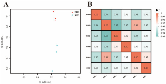 Relationship analysis of sexual size dimorphism in M. nipponense. (A) Principal component analysis (PCA) of different transcriptome samples; (B) Inter-sample correlation coefficient heatmap.