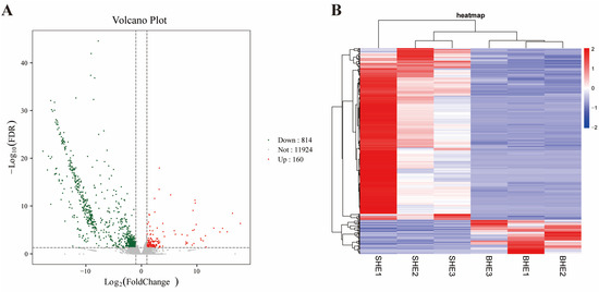 (A) Volcano plot of DEGs between SHE and BHE groups. (B) Heatmap of DEGs between the SHE and BHE groups. DEG, differentially expressed gene; FDR, false discovery rate.