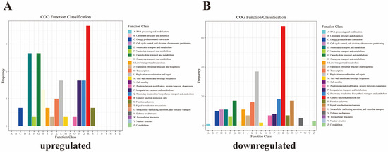 Clusters of orthologous groups (COG) functional annotations of DEGs (A) upregulated DEGs; (B) downregulated DEGs.