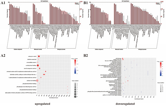 GO enrichment (Figure 5) categorized all DEGs into three groups: molecular functions, cellular components, and biological processes. A total of 43 GO terms (for the upregulated DEGs) and 49 GO terms (for the downregulated DEGs) were enriched, among which the highest classification terms were “binding” (48 DEGs) and “cellular process” (262 DEGs), respectively (Figure 5(A1,B1)). Further examination revealed that the upregulated DEGs were enriched in “endocytic vesicles”, “carbohydrate binding”, and “sterol transporter activity”. Conversely, the downregulated DEGs were enriched in “glucuronosyltransferase activity”, “cell division”, and “mitotic cell cycle” (Figure 5(A2,B2)).