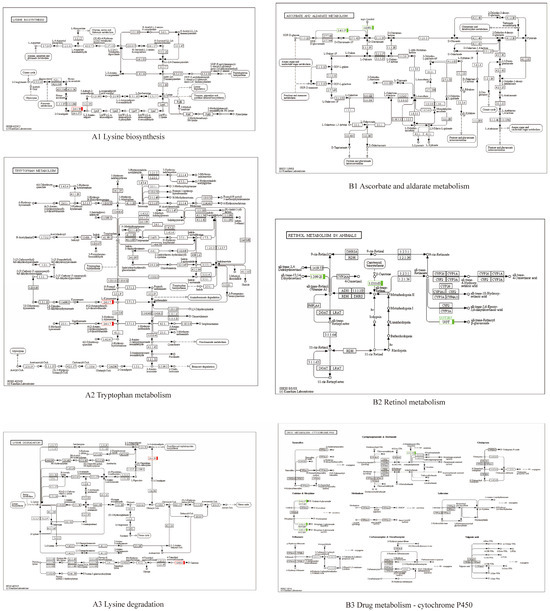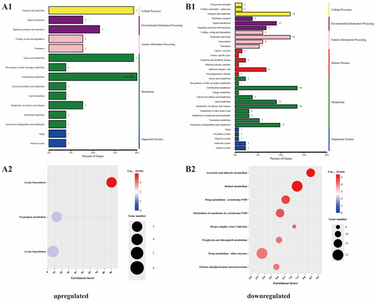 KEGG analysis was used to determine the enrichment of the DEGs for metabolic pathways. The upregulated DEGs were enriched for 16 pathways and the downregulated DEGs were enriched for 33 pathways. In total, six types of KEGG pathway were identified in the downregulated group. In addition to pathways related to human diseases, other types of pathways were also associated with the upregulated group; however, there were differences in the degree of enrichment (Figure 6(A1,B1)). Further examination revealed that the upregulated DEGs were significantly enriched in “lysine biosynthesis”, “tryptophan metabolism”, and “lysine degradation”. Conversely, the downregulated DEGs were significantly enriched in “ascorbate and aldarate metabolism”, “retinol metabolism”, and “drug metabolism-cytochrome P450” (Figure 6(A2,B2) and Figure 7).