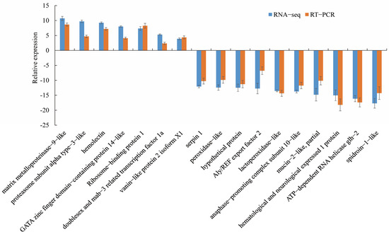 To validate the RNA-seq data, 17 DEGs were selected for RT-qPCR analysis. PCR primers (Table S1) were designed using a Primer designing tool (https://www.ncbi.nlm.nih.gov/tools/primer-blast/, accessed on 17 April 2024).