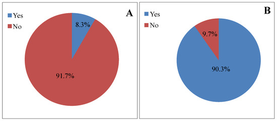 Results presented in Figure 2A,B showed that 8.3% of the participants declared participating in trainings, awareness campaigns, or workshops related to toxoplasmosis, while 90.3% declared that they support any initiative aimed at controlling toxoplasmosis.