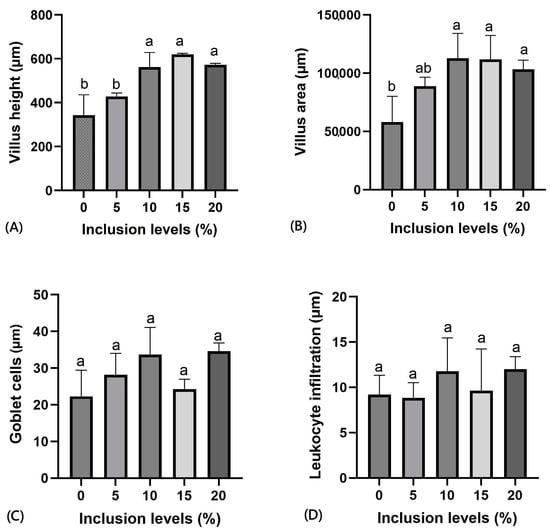 Intestinal morphology of Nile tilapia fed diets containing different levels of ora-pro-nóbis meal inclusion: (A) villi height; (B) villus area; (C) number of goblet cells; (D) number of leukocyte infiltrations. Different letters above the error bar indicate significant differences (p ≤ 0.05) from each other according to Duncan’s test. Values are expressed as means ± standard deviation.