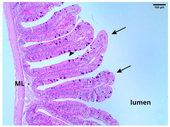 Photomicrograph of the small intestine of O. niloticus. Cross-section of the small intestine of tilapia showing the general organization, with the mucus layer in the form of villi (arrows). The numerous small goblet cells (arrowhead) are seen in the columnar epithelium lining the intestine in the previous plate stain purple with PAS/AB stain. Smooth muscle layer (ML).