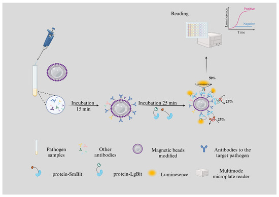 A schematic diagram of the lysis– NanoLuc complementation assay for the detection of the antibody of interest. Protein A/G magnetic beads are enriched for antibodies in serum. Protein A/G magnetic bead–serum complexes were incubated with LgBiT/SmBiT protein fusion probes. One Fab arm of the IgG antibody binds to the LgBiT sensor, and the other Fab arm binds to the SmBiT sensor, recombines with the NanoBiT luciferase, and generates an active luciferase signal. Antibodies can also specifically bind to LgBiT or SmBiT fusion sensors without luciferase activity, resulting in a 50% functional enzyme reconstitution rate. The luminescence signal is detected through a multimode microplate reader to determine the negative and positive values of the sample.