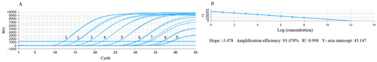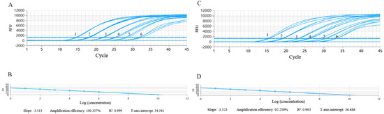 | Project | Parameter | Ct Average Value (3.12 × 105/3.12 × 104/ 3.12 × 103 copies/μL) | Amplification Efficiency/R2 |