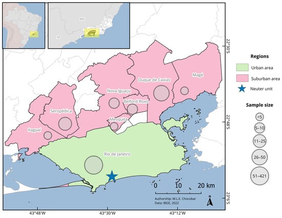 Although all samples were collected at the same spay and neuter unit, dogs and cats came from eight different municipalities of Rio de Janeiro State. These represented the urban area of Rio de Janeiro city and the suburban area, constituted of Belford Roxo, Duque de Caxias, Itaguaí, Magé, Mesquita, Nova Iguaçu, and Seropédica [].