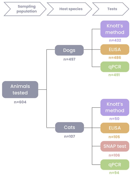 Flowchart indicating the number of samples processed by the modified Knott’s method (purple), ELISA (orange), SNAP test (pink) and duplex qPCR (green) for each animal species.