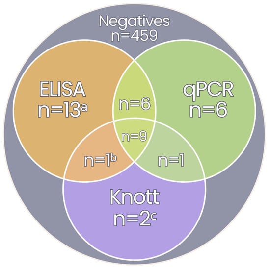 Venn diagram showing the distribution of 37 dog samples positive for D. immitis and one sample positive for Acanthocheilonema reconditum across different diagnostic methods: negative for all tests (grey), ELISA (orange, n = 29), Duplex qPCR (green, n = 22) and Knott’s modified test (purple, n = 13), including their overlaps. a Three samples were analysed exclusively by this method; b Sequenced as Dirofilaria immitis (100% identity); c One sample was sequenced as Dirofilaria immitis (99.63% identity) and the other as Acanthocheilonema reconditum (100% identity).