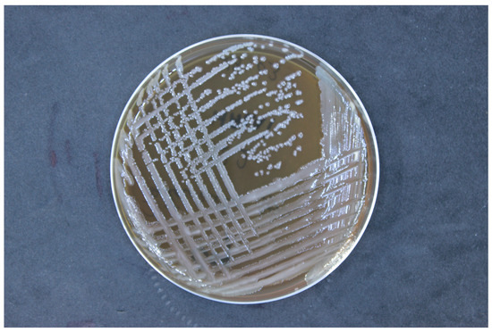 Then, the strain was cultured on nutrient-rich media, trypticase soy agar (TSA). Incubation was conducted at a temperature of 37 °C under aerobic conditions. The pH of the culture medium was maintained within the range of 7.0 to 7.5, and the incubation period was 24 h (Figure 2). The isolated strains were identified using matrix-assisted laser desorption/ionization time-of-flight mass spectrometry (MALDI-TOF MS, Bruker Daltonik, Bremen, Germany). The bacterial samples were prepared using an ethanol/formic acid protocol, applying 1 μL of bacterial protein suspension to an MALDI target plate, followed by the addition of 1 μL of a matrix solution (10 mg α-cyano-4-hydroxycinnamic acid per mL in 50% acetonitrile and 2.5% trifluoroacetic acid). Mass spectra were obtained using the Microflex™ mass spectrometer (Bruker Daltonik) and analyzed with MALDI BioTyper™ 3.0 software, according to the manufacturer’s criteria: a score of ≥2.0 confirmed species-level identification, while scores between 1.7 and 2.0 suggested genus-level identification.