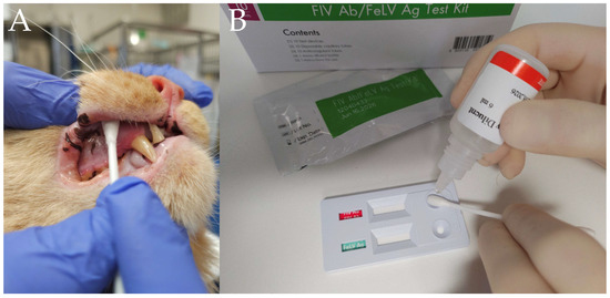 (A) Cotton tip placement against the buccal mucosa for saliva collection. (B) The cotton tip was positioned directly on the sample well of the Anigen Rapid® FIV kit and test buffer was applied while the cotton swab was gently rotated. The result was read 10 min later by two observers.