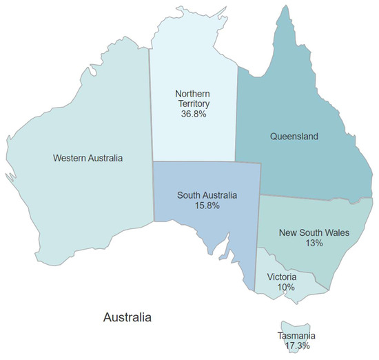 Cats in Victoria were the least likely to be infected (10%), while cats in the Northern Territory were more likely to be positive than cats in other geographical locations (p = 0.045). The odds of Northern Territory cats being FIV-positive were 5.25 times (95% CI 1.79–15.4) higher than cats in Victoria, where cats were at the lowest geographical risk (Figure 2).