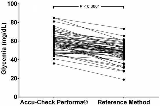 Only two samples (2.9%) showed PBGM values below those obtain by the RM, and one (1.5%) showed the same results in both methods. The other 65 samples (96.6%) had higher values from the PBGM. The mean glucose values read by the PBGM (58.5 ± 9.82 mg/dL) were significantly higher (p < 0.0001) than the results obtained by the RM (mean = 48.6 ± 9.31 mg/dL) and are represented in Figure 1. This distortion means that the PBGM suggested that 4.41% of the samples indicated hyperglycemia (>80 mg/dL), while no hyperglycemic values were documented using the RM.