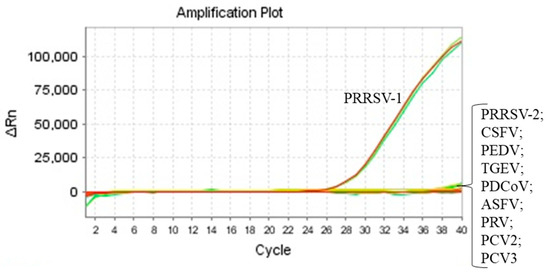 - Chen, N.; Ye, M.; Xiao, Y.; Li, S.; Huang, Y.; Li, X.; Tian, K.; Zhu, J. Development of universal and quadruplex real-time RT-PCR assays for simultaneous detection and differentiation of porcine reproductive and respiratory syndrome viruses. Transbound. Emerg. Dis. 2019, 66, 2271–2278. [Google Scholar] [CrossRef]