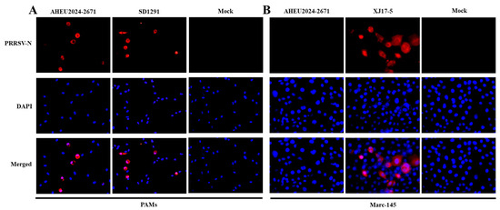 PRRSV-1 isolation in PAMs and Marc-145 cells. (A) The infected PAMs were examined by IFA at 48 hpi. PRRSV-1-specific antigen was detected in AHEU2024-2671-infected PAMs. PRRSV-1 SD1291 isolate-infected cells were used as positive control [24], while mock-infected cells were set as negative control. (B) The infected Marc-145 cells were also examined by IFA at 48 hpi. PRRSV-1 specific antigen could not be detected in AHEU2024-2671-infected Marc-145 cells. PRRSV-2 XJ17-5 isolate-infected cells were used as positive control [9], while mock-infected cells were set as negative control.